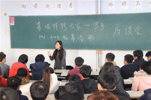 26日上午9点,罗多教授与2012、2013级幕墙班的全体员工在土木教学楼411教室进行了较深入的座谈。她从幕墙的发展现状谈到绿色建筑以及她目前从事的光伏研究,她谈到的每一个问题都引起了同学们极大的兴趣。她结合自身学习成长经历,和同学们分享了在当今这个充满的社会里,如何找到一份适合自己的工作。座谈进行了一个多小时,同学们意犹未尽。