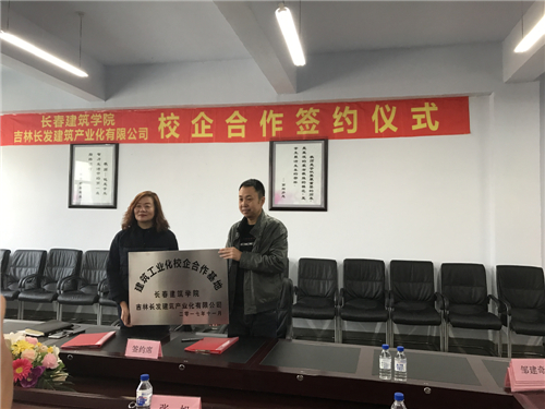 接下来,邹建奇经理代表公司与吉林长发建筑产业化有限公司马海滨经理签订校企合作框架协议。最后,进行了授牌仪式。