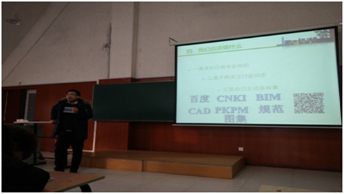 首先陈老师进行了自我介绍,接着陈老师从从四个方面进行交流。一、介绍绿色建筑方面的概念与知识;二、2016-2017年装配式所发生的大事件;三、向同学们介绍公司绿建专业方向目前的发展状况;四、我们应该做什么。同学们热情洋溢的积极回应,并与老师进行交流一些自己的疑问,老师也表达了对我们的期望。