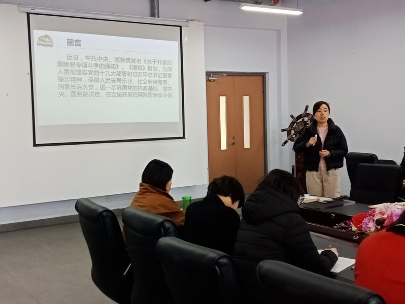 党总支书记管爱华以员工群体间发生的实例向大家强调了“扫黑除恶”工作开展的必要性和重要性,他要求全体师生党员要以身作则,树立良好道德典范。