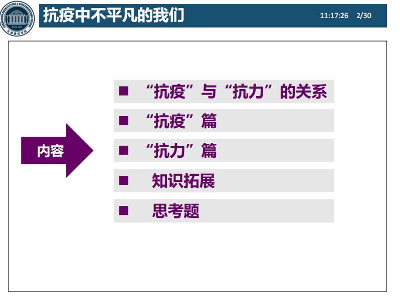 陈老师的课程体现创新性。通过“抗疫”与“抗力”逻辑关系引入,利用表格对概念、控制界限、引起后果、抵抗因素进行并列对比分析。“抗疫”与“抗力”看似无关,原理实则相通。使员工理解如何抓住主要矛盾,解决实际问题的途径。然后以“共同抗疫”这一关键词,通过“抗疫”篇有代表的图片,从政府、社会、公司、公司等正能量展示,与员工互动,巧妙融入思政元素。使员工坚信:冰雪终会消融,疫魔总会散去,我们众志成城,共迎花开疫散。激励员工学好本领共同抗疫!