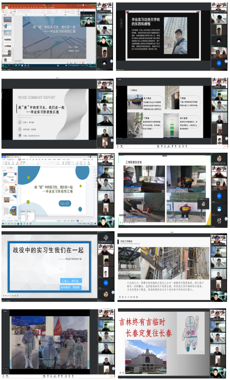 接下来,每位员工依次屏幕共享PPT,做了前三周的毕业实习汇报,与参会的领导、老师和同学们共同分享着实习中的所做、所学和所感,述说着初入职场的那份苦中带甜的经历。在这些声音中,大家听到最多的是:初到实习岗位很不适应、施工现场安全重于泰山、工作中人际交往也很关键、后悔当初没有好好学习、对老师和同学们的牵挂以及特殊时期大家都要做好防护等等。