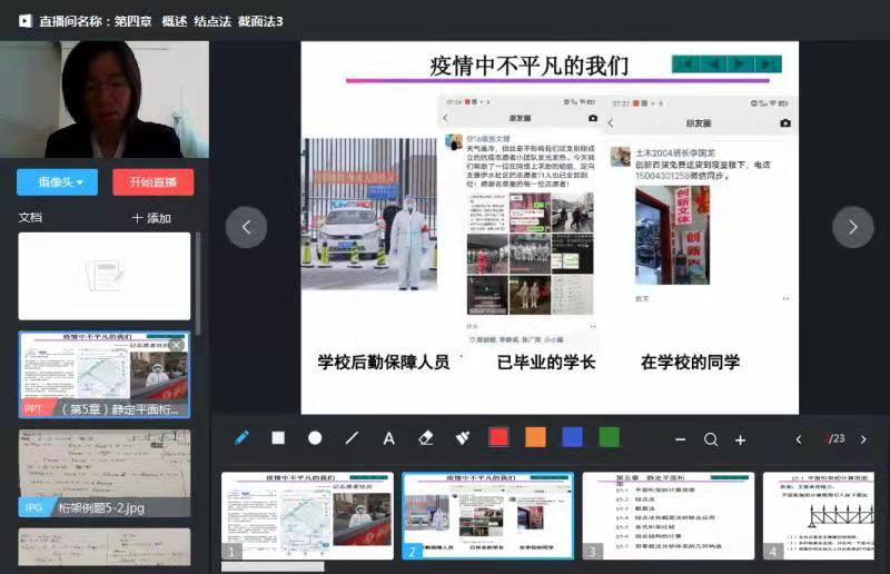 在同学们为疫情中这么多人默默付出的感动中,郑老师开始了本次的直播课。力学给人的感觉是一门比较枯燥的课,然而郑老师却是把这样课讲的精彩分层,吸人眼球。课上一共介绍了三方面的内容,包括平面静定桁架的计算简图、结点法、截面法。