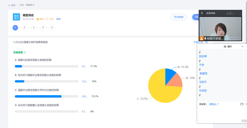 环节三:为了更好地了解员工的听课状态,缓解线上课出现溜号、挂课等现象,采用随堂测试、主题讨论等方式让同学们参与其中,通过学习通的大数据,精准掌握问题所在,既调动了员工的积极性,又点对点的解决了问题,收到了良好的效果,感觉比在线下的效果更好。