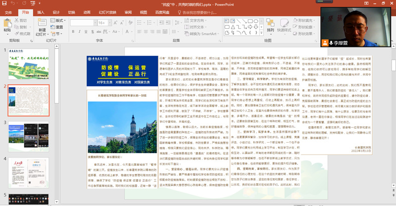 2022年3月16日上午,永利yl钢结构教研室李厚萱老师在课程《钢结构设计》课前以《“抗疫”中,共克时艰的我们》为主题,对土木1901-1902班同学们进行了暖心问候及思政教育。