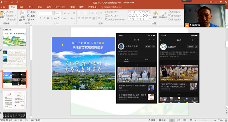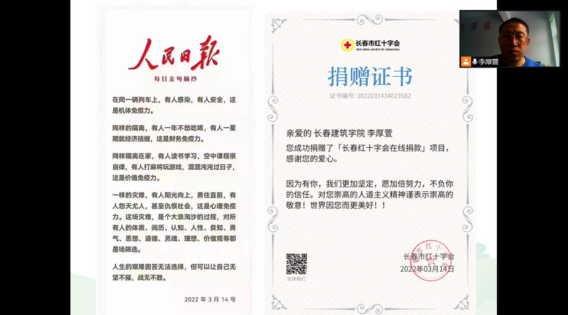 随后,李老师引用《人民日报》每日金句摘抄里的句子,要求同学们在线上课程学习期间,要严格要求和约束自己,认真听课、做好笔记、和老师及时反馈学习状态和学习成果,在这样特殊时期一定要对自己认真负责。李老师以自己捐款长春市红十字会为例,引导同学们特殊时期内心要充满正能量。