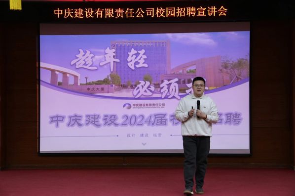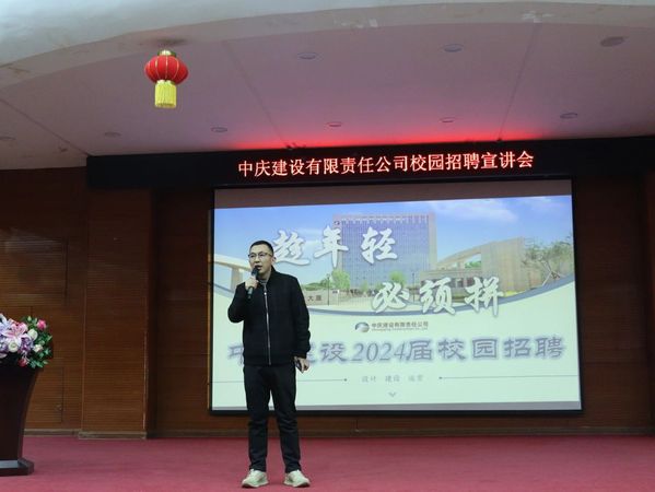 随后,中庆建设有限责任公司修皓文主任通过宣传片对企业的概况等进行了介绍,并亲自就三个方面对公司进行了宣传。包括:对公司在驻地承建的双阳神鹿峰、6号线地铁、力旺小区、人民大街改造等标志性项目进行了具体的介绍;对新入职老员工在企业成长为技术和管理骨干两条路径进行了解读;对公司的待遇、福利、活动进行了展示。修主任表示:欢迎同学们到中庆建设有限责任公司工作和实习,来到中庆一定能够有所收获。