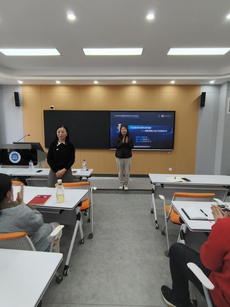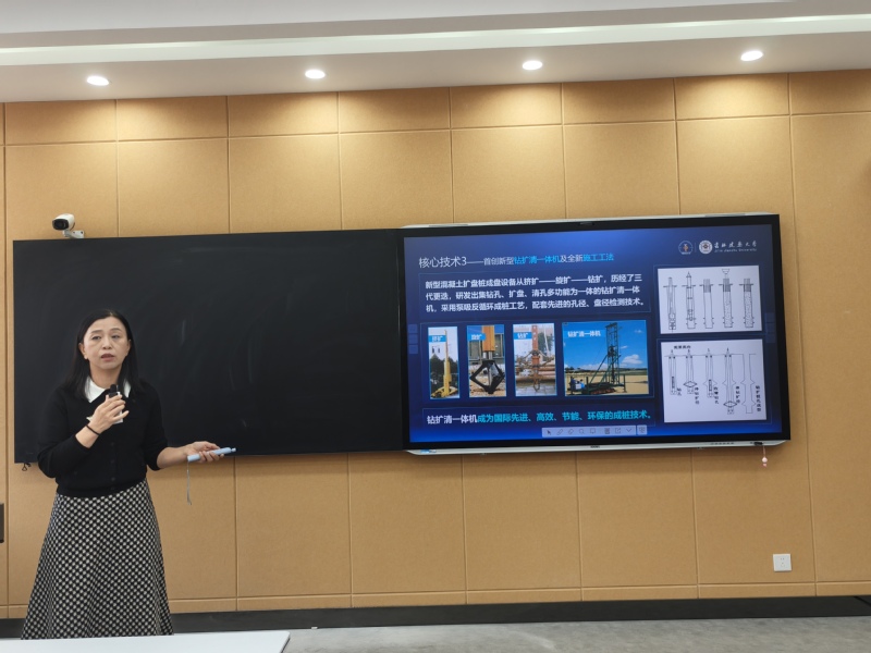 钱永梅教授以 科研育人新范式 开篇,着重强调科研能力培养前移的重要性,指出本科生群体正在成为科研创新的新兴力量。她结合自身团队的创新实践,系统阐释了新型混凝土扩盘桩技术的研发脉络:从桩型演变史切入,详细解析该技术在施工工艺革新、力学性能优化等方面的突破;通过图文并茂的演示和详实的数据对比,系统阐释了该技术从理论研究到工程应用的完整创新链条。特别针对两项核心技术 ——“新型半面桩多工况全程可视化试验方法” 与“创新滑移线理论智能化成套设计计算平台”,钱教授通过实验室模拟视频与工程实例分析,生动展现了科研成果转化生产力的具体路径。