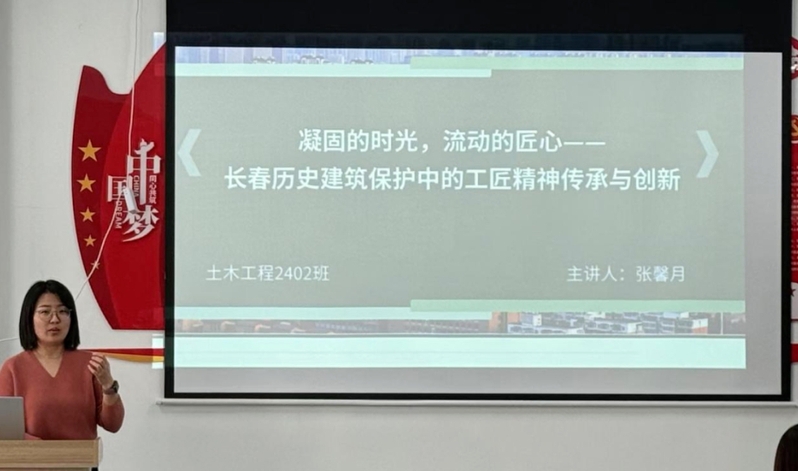 首先,张馨月老师分享了长春城市的发展历程,从工业基地建设到文化保护意识觉醒,再到文化旅游融合发展,同学们对家乡的变化感到自豪。在讨论长春历史建筑的现状与保护措施时,同学们积极发言,分享自己对这些建筑类型和文化价值的理解,同时也提出了对保护挑战的看法。张老师耐心聆听每位同学的见解,并巧妙融合法规保障、修缮技艺及环境整治等多维度内容,激发同学们对历史建筑保护重要性的深刻思考。围绕“工匠精神”核心内涵,张老师通过长春修缮工匠的口述史视频,展现匠人用传统榫卯技艺修复老建筑的细节。“他们用一把锤子、一块砖瓦,让历史‘活’起来。”张老师以丰乐剧场修缮案例回应:数字化建模与手工技艺的融合,正是当代工匠精神的具象化。现场讨论热烈,师生们纷纷提出‘组建传统技艺学习小组’‘参与老建筑测绘实践’等创新思路,共同勾勒出‘传承+创新’的鲜明实践路径。