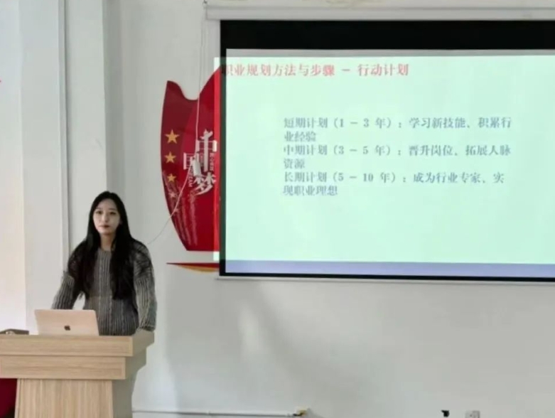 活动中,同学们共同观看了职业规划专家视频,学习如何通过自我评估、职业探索和目标设定三步走策略规划未来。于老师结合往届优秀员工的真实案例,进一步剖析了“兴趣+能力+行业需求”的匹配逻辑,并建议同学们:“职业规划不是一成不变的蓝图,而是动态调整的过程。大家要通过实习、竞赛、证书考取等方式持续积累‘硬实力’,同时培养沟通协作、创新思维等‘软技能’。”
